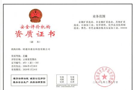 2003年11月10日,昭通市鼎安科技有限公司成立,初始主要從事第三方安全工程技術(shù)服務(wù),經(jīng)多年運(yùn)營,發(fā)展為多專業(yè)綜合科技平臺(tái),為社會(huì)提供多種專業(yè)技術(shù)服務(wù)工作。 現(xiàn)公司注冊資金為1200萬元,公司法定代表人:毛衛(wèi)旭。公司主要業(yè)務(wù):安全評價(jià)、安全標(biāo)準(zhǔn)化評審、安全工程技術(shù)服務(wù);環(huán)境監(jiān)測、職業(yè)衛(wèi)生檢測、檢驗(yàn);法律訴訟及非訴訟服務(wù);司法鑒定、固定資產(chǎn)投資項(xiàng)目節(jié)能服務(wù);工程咨詢;工程測量測繪;安全教育培訓(xùn)等。是安全生產(chǎn)服務(wù)、安全教育培訓(xùn)機(jī)構(gòu),也是環(huán)境監(jiān)測和職業(yè)衛(wèi)生服務(wù)機(jī)構(gòu),同時(shí)也是綜合的檢測檢驗(yàn)、綜合科技平臺(tái)服務(wù)機(jī)構(gòu)。多年來為公、檢、法、司、軍、警、海關(guān)、仲裁、安監(jiān)、工礦商貿(mào)企業(yè)、社會(huì)團(tuán)體及個(gè)人提供多專業(yè)技術(shù)服務(wù)。